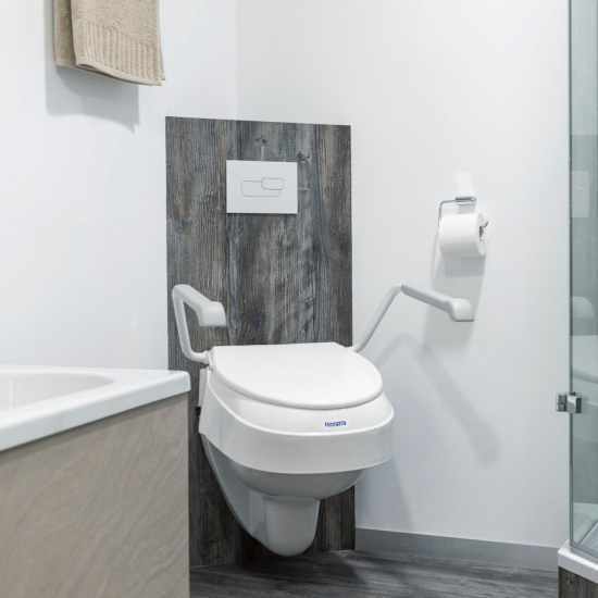 Aquatec AT900 — это регулировочное сиденье для унитаза, предназначенное для людей с ограниченной подвижностью или в период реабилитации. Эргономичные подлокотники откидываются, чтобы обеспечить поддержку при посадке и вставании и не мешать пользователю. Сиденье фиксируется двумя винтовыми зажимами на верхней части унитаза; поверхностью легко ухаживать. Предлагается три уровня высоты (6, 10, 15 см) и три угла наклона, позволяющие понизить переднюю часть сиденья для более удобной позы. Большой санитарный вырез облегчает гигиену. Конструкция прочная и рассчитана на пользователей весом до 120 кг.